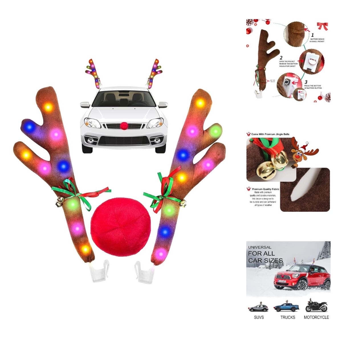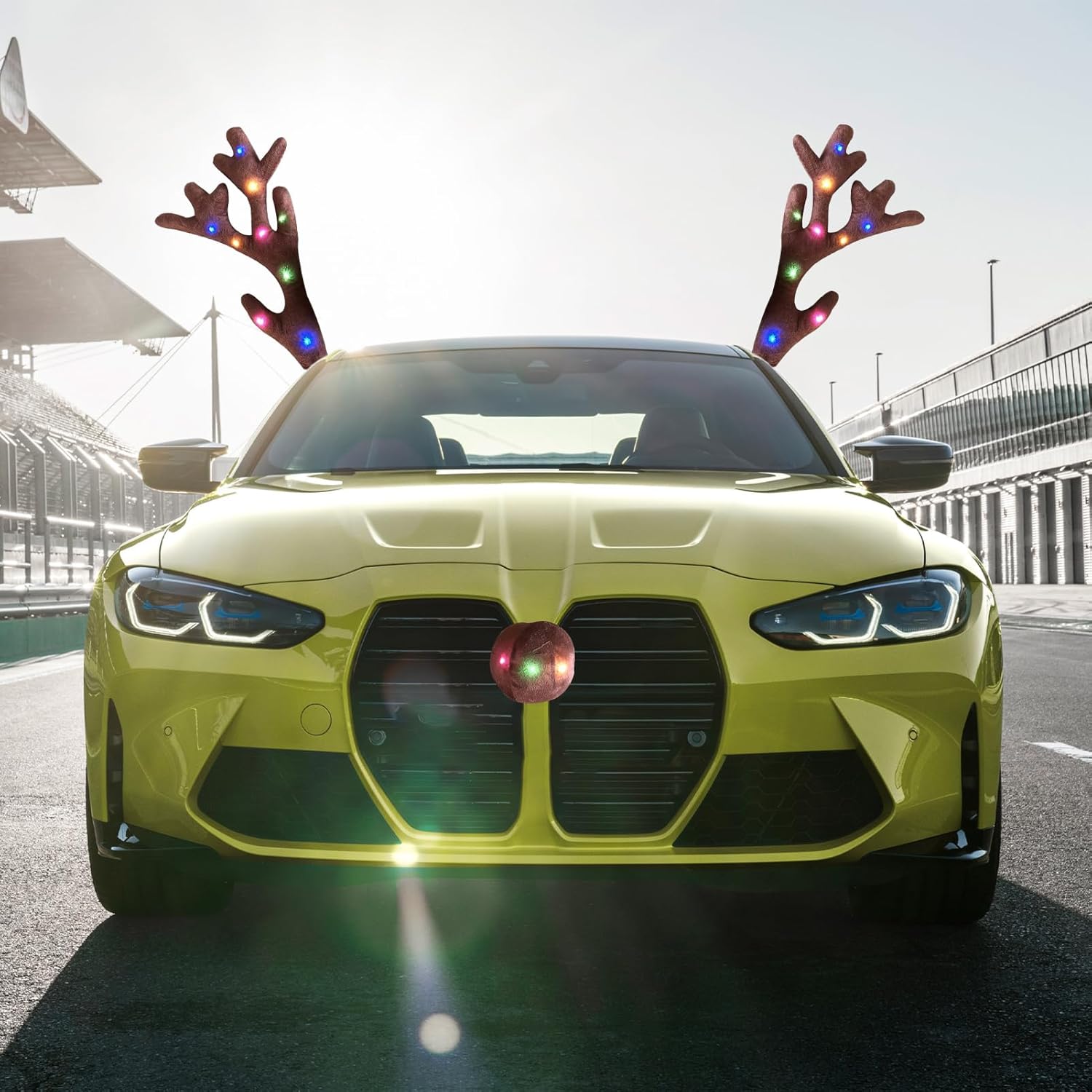 Solo engancha los cuernos en las ventanas y coloca la nariz en la parte delantera. ¡Y listo para brillar en cada recorrido!